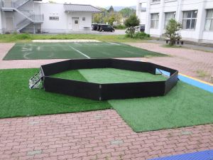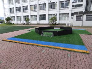 (写真は、校舎中庭に設置されたミニサッカー場です。昨年度より、始まりました。これから生徒会でルールを設定し、主に昼休みに開放する予定です)
