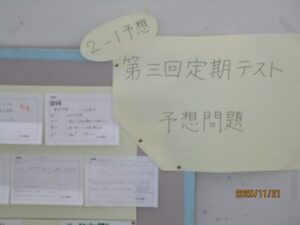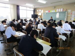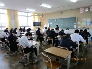 今日は、1・2年生が第3回定期テスト、3年生が実力テストと、どの学年も朝からテストに取り組んでいます。
