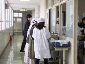 1年生は、中学校での初めての給食です。先生と協力しながら配膳していました。