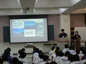 今日は守山市環境コーディネーターの方に学校に来ていただき、SDGsのことや17の目標について説明いただくとともに、